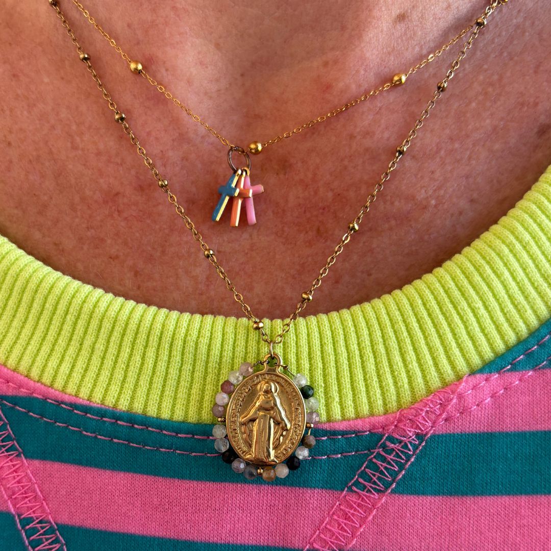 Su cadenita dorada sostiene tres pequeñas cruces esmaltadas en rosa, azul y coral, que simbolizan amor, protección y esperanza en cada paso del día.